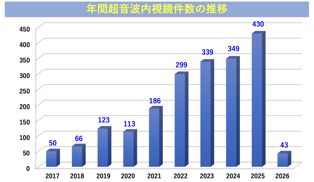 これは、膵臓や胆道疾患に対するEUS検査の重要性が地域に浸透してきたこと、そして多くの患者さんに当院を信頼して受診していただいた結果だと感じています。