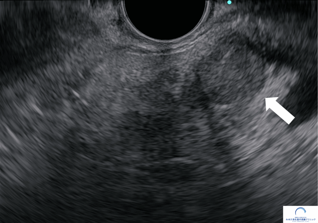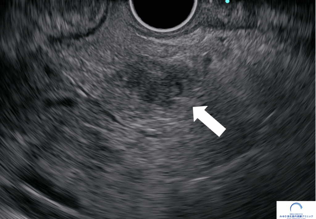 他院での腹部エコー、CT、MRIでは膵臓に異常を認めませんでしたが、当院での超音波内視鏡検査で10mmの腫瘤を認めました。超音波内視鏡せん刺吸引法(EUS-FNA)で神経内分泌腫瘍と診断しました。