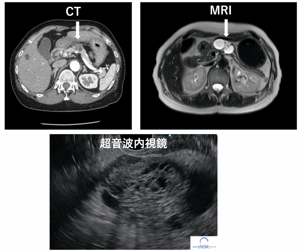 当院では、これまでEUS専門施設で多数の検査経験を積んだ医師が担当し、専門的なEUS検査を地域でも受けられる体制を整えています。また、膵臓を詳しく調べたい方のために、MRIとEUSを組み合わせた「膵がんドック」も実施しています。このドックでは、MRIで膵臓全体を広く評価し、EUSでより細かな異常を確認することで、早期の膵がんや膵嚢胞の発見につなげることが可能です。👉 当院の膵がんドックについてはこちらhttps://miyuki-cl.com/medical/medical03/